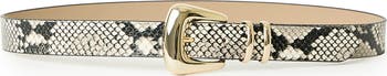 Gleaming goldtone hardware offers a cool, polished counterpoint to the serpentine pattern of this belt crafted in Italy from snake-embossed leather.