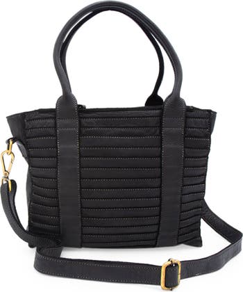 This is the perfect mid-size tote. It features beautiful patchwork details on the exterior with a barely visible phone pocket—compact size with ample storage.