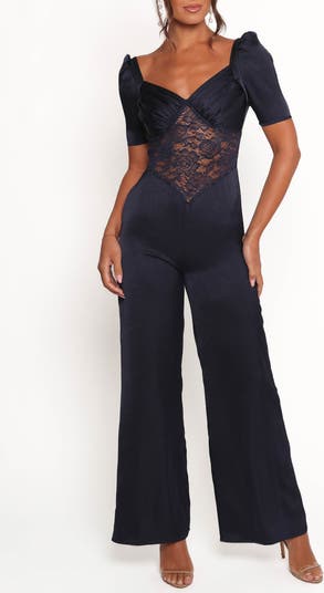 A sheer, floral-lace inset wraps around the waist of this alluring satin jumpsuit detailed with lightly puffed sleeves and a sassy open-back design.