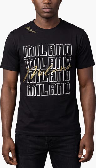 - Graphic: Stacked white “Milano” lettering with gold script overlay; small Roberto Vino label on the upper back