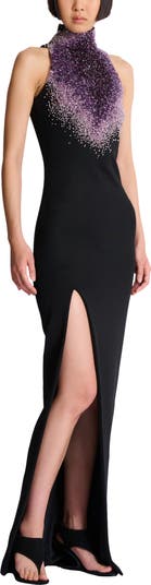 Milano jersey halterneck dress with "Amethyst" embroidery Long fitted cut with side slit Backless High neck with hook on the back Embroidered "Amethyst" front panel in mixed beads, sequins and crystals Matching metal zip fastening at the back Model measures 178cm and wears a size 36 Main material: 60% viscose 30% polyamide 10% elastane Made in India Item: GF0RPB25PD45 100% of the viscose fibres used to make this garment come from certified, sustainably managed forests