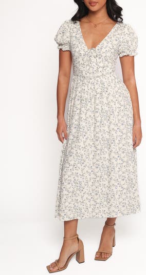 Enchanting blooms romance this light and lovely maxi framed by charming puff sleeves and finished with a flared skirt that sways with every step.