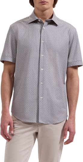 Neat geometric patterns enliven a warm-weather shirt tailored from breathable, wrinkle-resistant OoohCotton with a smartly pointed collar and a hem that looks great when you leave it untucked. The smooth, double-mercerized knit fabric dries quickly for moisture-managing softness and consistent body temperature.