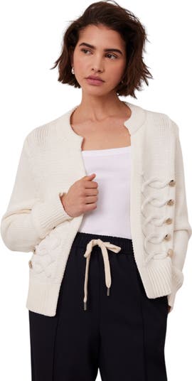 White knit jacket featuring a crew neckline, long sleeves, knit design with gold-tone military inspired buttons.