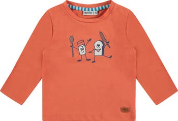 This cayenne orange-toned long sleeve features an adorable milk and toast character graphic.