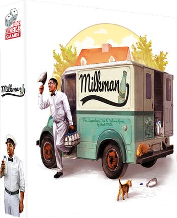 MILKMAN - It's the fabulous '50s in America. Hometown pride is in full swing, everybody likes Ike, and the baby boom is exploding all over. What those growing families need is something fresh, something local, and something healthy, and you've got just the thing - milk! In Milkman, you'll take on the role of a local dairy farmer, doing your best to manage your farm, keep the cows happy, process and deliver whole, skim, and chocolate milk, and persuade local customers that your milk is definitely the freshest and tastiest around. Each round, all players roll a certain number of custom dice with all the actions available to do what's mentioned above. They may press their luck and re-roll those dice a couple of times, or match up sets to get the result they want. The active player will have a few more dice to work with which, unfortunately, can't be re-rolled, but can be manipulated with cash on hand. Throughout the game, players will have to decide how best to manage their time, either expanding the farm for more flexibility and output, grabbing valuable customers before others can, or shipping out that delicious milk to customers for pride and reputation. Milkman plays quickly, is easy to teach, and comes with great components like custom dice, personal farming and neighborhood boards, cow meeples, and much more.