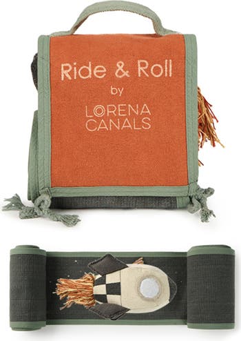 Perfect for on-the-go fun, this darling two-in-one canvas set features a plush rocket and a star-flecked and planet-studded galaxy backdrop. When not being used for play, the road can be rolled and tied together, converting into a conveient briefcase-style bag.
