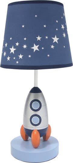 - A coordinating rocket ship with a starry shade is the perfect lamp to grow with your baby