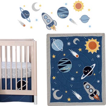 This out-of-the world crib bedding set includes one quilt (36” x 45”), one 100% cotton fitted crib sheet (28” x 52”), one appliqued crib skirt (27” x 51” with a 14.5” drop), and a complete set of wall appliques. Your little one will sleep and play among the stars and planets in this unique crib bedding set. A gray textured fabric frames the quilt and the appliqued planets and stars float on a deep blue background. The 100% cotton fitted crib sheet and back of the quilt has multiple sized white stars on a pretty, gray ground. The crib skirt has a Saturn applique on the right corner and the colorful wall appliques feature the planets, sun, moon and a rocket ship. They are easy to apply. No tape, no tacks, no clutter and they are a great way to add a designer touch to the nursery. This nursery baby crib bedding collection is perfect for any little astronaut baby boy or girl. Imported.