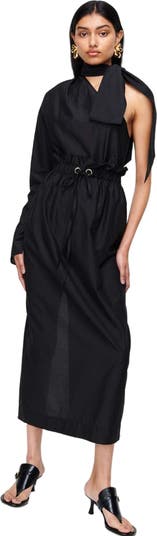 Paper bag drawstring fastening waist, features central rear vent, calf-length and straight hem.