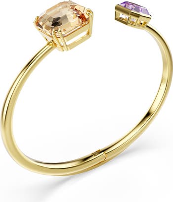 Bring a vibrant glow to your wrist with this open-band bangle featuring a bezel-set purple crystal and a double-pronged caramel crystal at the end points.