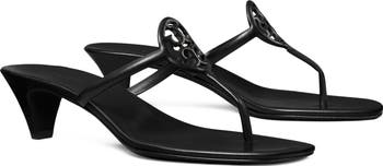 A signature T-monogram brings signature detail to the slim leather straps of this thong sandal balanced on a tapered kitten heel.