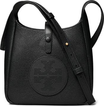 A perforated stacked-T logo centers this rich leather crossbody bag designed with a roomy interior and fitted with an adjustable strap for customized carry.