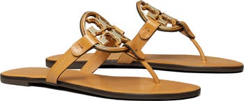 A lustrous logo medallion adds a signature flourish to the vamp of a rich leather sandal secured with a center toe post.