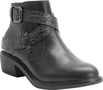 Artful embossing highlights the crisscrossing straps of a burnished leather bootie designed for optimal comfort and support.