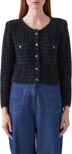 Twinkling metallic shimmer and high-shine buttons elevate this woolly cropped cardigan.
