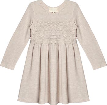 This girl's dress is crafted from a soft, cozy fabric in a delicate beige hue. The long sleeves and smocked bodice create a timeless, elegant look, while the gathered skirt adds a touch of playfulness. Perfect for cooler days, this dress combines comfort with classic style for any occasion.