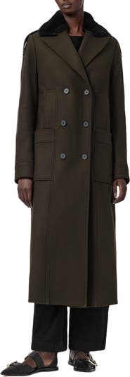 Lambskin epaulets and a removable shearling collar luxuriously appoint this wool-blend peacoat extended to a calf-grazing length.