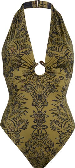 This sleek swimsuit printed in a baroque floral showcases a plunging halter neckline centered with a stone-embellished ring.