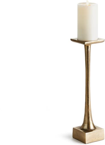 - With a weighted base and tall slender body, this candle stand is a smart design. With classic lines, it plays well in the transitional as well as traditional space. Add your favorite pillar candle for a warm glow. Interior use. Clean with damp cloth. Avoid chemicals that may be harmful to finish. Never leave a burning candle unattended. Use only LED flameless candles when specified. 4.75 x 4.75 x 12 4.75 x 4.75 x 12