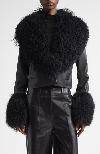 Step back in time before stepping out into the cold when you don this moto-style jacket tailored from lambskin leather and framed at the shawl collar and cuffs in long, curly genuine shearling.