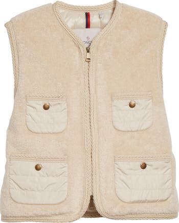 Passementerie-inspired braided trim lends retro charm to this down-insulated vest made of plush teddy fabric contrasted with smooth nylon accents.