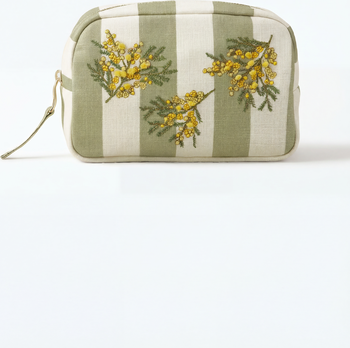 Inspired by the sunlit charm of wild mimosas, this makeup bag features delicate golden blossoms against a classic soft green stripe. Treat your makeup to a beautiful new beautiful new home, complete with intricate embroidery on soft velvet.