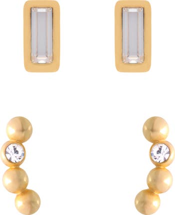 Baguette-cut and circular crystals accent this set of stud earrings that features geometric and bubbly shapes.