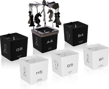 What it does: Each exquisite votive candle is meticulously crafted, featuring sophisticated design and captivating fragrances. This set of six candles is accompanied by a carousel that rotates when touched by the heat of the candle flame. The spinning carousel projects enchanting light and shadow effects inspired by the chess pieces the MIND GAMES collection represents.