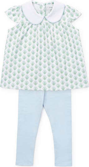 Cap sleeve printed top with contrast piping detail along the peter pan collar paired with solid pima/lycra blend leggings. Made from 100% Peruvian Cotton.