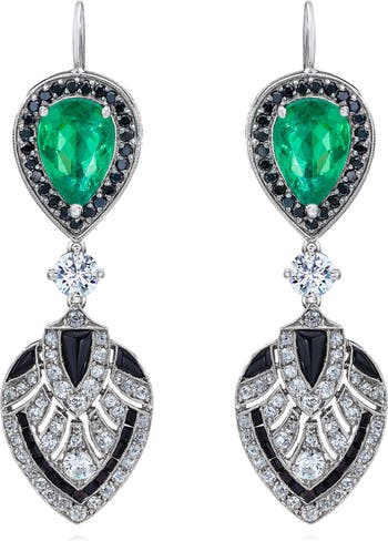 White diamonds, black diamonds and emeralds bring rich shine to these drop earrings that glitter with every turn of your head.