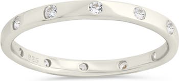Flush-set round cubic zirconia sparkle along this stackable ring crafted from polished sterling silver or warm 14-karat gold plate.