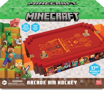 MINECRAFT ARCADE: AIR HOCKEY (CORE SERIES) - NETHER - Bring the thrills and excitement of the arcade home with Minecraft Arcade: Air Hockey (Core Series) – Nether Edition! A longtime arcade favorite, air hockey delivers fast, competitive fun as the puck glides and rebounds across the surface at high speeds. Now, that same energy is ready for play in a compact, affordable size—perfect for Minecraft fans. Power on the table to activate airflow and watch the puck hover smoothly just like in the arcade. Challenge a friend and aim for the winning shot—firing straight at the goal or banking off the walls to outsmart your opponent. Featuring an Nether-inspired design and fan-favorite Minecraft characters, every match feels like a spirited game inside the blocky universe. With two customizable pushers and 14 interchangeable pusher covers, players can personalize each matchup with their favorite Minecraft characters. Track the action easily with the built-in score bar as you race to seven points to claim victory. Compact, cost-effective, and full of arcade flair, this Core Series game offers classic air hockey fun at an accessible price—ideal for smaller spaces, apartments, and shared play. FEATURE HIGHLIGHTS: Iconic Minecraft - Nether themed music. Muted-mode gameplay available. Easily swap between 14 pusher covers. Play with your favorite Minecraft characters. Powerful airflow keeps the puck hovering. Includes 2 customizable pushers. High-speed arcade-style gameplay. Features Steve, Alex, Ghast & more. Explore the worlds of Minecraft — Nether version. Track every goal with the built-in score bar. First player to reach 7 points wins! ADDITIONAL DETAILS: Compact, cost-effective design with classic gameplay. Offers arcade fun at an accessible price point. Perfect for small spaces, including apartments. Pusher covers let kids personalize gameplay & swap characters. Dimensions: 16.5" (L) × 8.9" (W) × 3.1" (H).