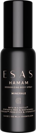 - HOW IT WORKS : Inspired by the ancient Hamam ritual, Esas Hamam Deodorizing Body Spray is your "bath in a bottle," designed to purify, cleanse, and refresh. Rooted in a tradition that dates back to the 14th century, this unique body spray brings the essence of Roman baths into the modern day. Scientifically formulated with the purest ingredients, including Certified Organic Botanical Alcohol*, Witch Hazel, Coconut-Derived Glycerin*, and Esas DeoScent™ Sugarcane Ferment*, it effectively cleanses, deodorizes, and refreshes your skin wherever you go. Enriched with hydrating hyaluronic acid, vitamin E, and antioxidant-rich grape leaf tincture, this spray not only purifies but also nourishes, leaving your skin feeling revitalized and lightly scented. Perfect for an on-the-go refresh, it's the ultimate solution for staying clean, refreshed, and fragrant throughout your day.