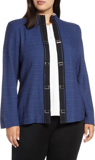 Gleaming buckles down the solid-trimmed front add modern edge to a polished and classic-cut jacket in a comfortable two-tone knit.