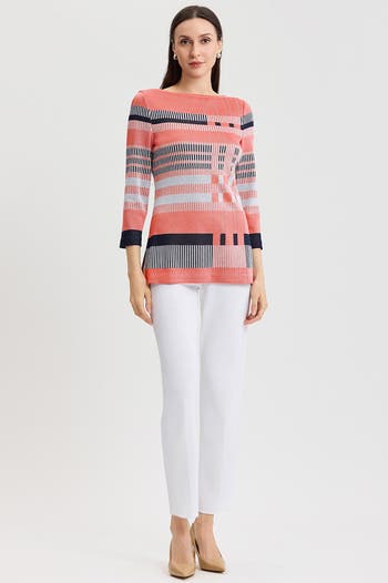 The Classic Jacquard Colorblock Soft Knit Tunic is a versatile women’s spring tunic top designed for effortless warm weather style. Featuring a refined boat neckline, modern colorblock pattern, and side slits for ease of movement, this lightweight knit tunic offers a flattering, relaxed fit. Machine washable and easy to wear, it’s an ideal casual chic top for spring and summer, perfect for travel, weekend outings, and everyday occasions.