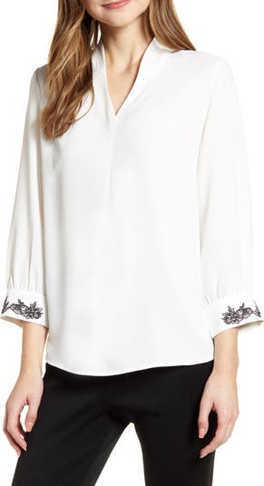 An easy-fitting tunic with drapey, bracelet-length sleeves adds a pop of interest with floral embroidery at each cuff.
