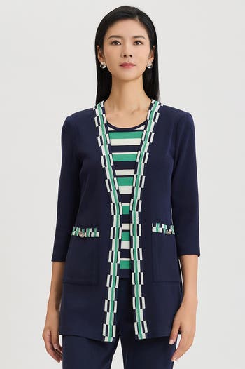The Checkered Trim Soft Knit Jacket blends polished ease with everyday versatility, crafted in a comfortable, machine washable knit with functional pockets for effortless wear. Checkered contrast trim adds a refined, modern touch that elevates simple separates. Perfect for spring and summer occasions, it layers seamlessly over dresses or coordinates for a fresh, put together look.