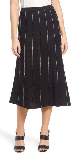 Modern stripes detail the calf-grazing cut of this sleek and versatile knit skirt that's wrinkle-free and travel-friendly.