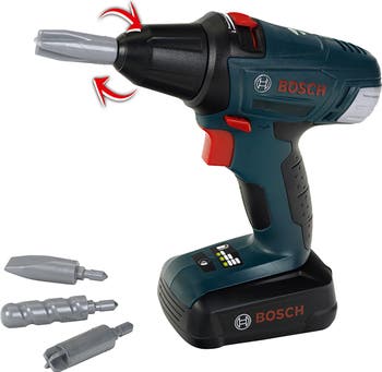 BOSCH CORDLESS DRILL & SCREWDRIVER - This Bosch cordless screwdriver not only looks incredibly similar to its original Bosch role model, it can actually do everything that the original can too ' just in a child-friendly way and safely: it has rotating, interchangeable drill/screwdriver bits, it can tighten or loosen screws, and it also makes authentic drilling and screwdriver sounds when in use. Thanks to its interchangeable bits, it can deal with any toy screw, and can also light up the working area at the press of a button. Of course it has been designed to be completely safe for children ' there are no sharp edges and the bit turns slowly so that it is child-safe. Safe fun, and there is even more to be had ' as the Bosch cordless screwdriver fits all the Bosch and Technico screw systems made by Klein Toys. It makes a perfect addition to ' or the best way to start ' a well-equipped play workshop. The Bosch-design toy cordless screwdriver has child-friendly functions, such as battery-powered, rotating, interchangeable drill/screwdriver bits, clockwise/anti-clockwise motion and realistic drilling and screwdriver sounds with a light. The bits fit all the Bosch and Technico screw systems. Dimensions: 7.9 in x 2.6 in x 7.5 in. Suitable for children ages 3 years and up. Batteries required: 3 x R6-AA ' not included.