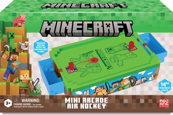 MINECRAFT ARCADE: MINI AIR HOCKEY - OVERWORLD - Bring the thrills and excitement of the arcade home with Minecraft Arcade: Mini Air Hockey – Overworld Edition! A longtime favorite in arcades everywhere, air hockey delivers fast, competitive fun as the puck glides, rebounds, and races across the table. Now, all that action is ready for play in a compact, collectible size made for Minecraft fans. Turn on the power to activate the airflow system and watch the puck hover smoothly over the play surface—just like at the arcade. Challenge a friend and take aim: shoot straight for the goal or bounce the puck off the walls to outsmart your opponent and score big. Featuring colorful Minecraft designs and fan-favorite characters from Overworld, the board brings the world of Minecraft to life, making every match look and feel like part of the game. With two customizable pushers and interchangeable pusher covers, players can personalize their setup before they play. Track the action with the built-in score bar and race to be the first to reach eight points and claim victory. Compact and durable, this mini air hockey game is perfect for bedrooms, game rooms, small spaces, and young players ready to bring arcade excitement home. FEATURE HIGHLIGHTS: Easily swap between 14 pusher covers. Play with your favorite Minecraft characters. Powerful airflow keeps the puck hovering. Includes 2 customizable pushers. Fast-paced arcade-style gameplay. Features Steve, Alex, Creeper & more. Explore the world of Minecraft — Overworld version. Track every goal with the built-in score bar. First player to reach 8 points wins! ADDITIONAL DETAILS: Small-scale air hockey game with vibrant Minecraft styling. Perfect size for younger players and smaller play areas. Durable playing surface for smooth puck movement. Minecraft-style integrated scoring system. Dimensions: 14.1" (L) × 7.5" (W) × 2.8" (H).