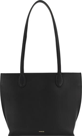 Subtle logo branding and clean lines highlight the smooth leather exterior of a spacious tote suspended from a pair of slender straps for comfortable carry.