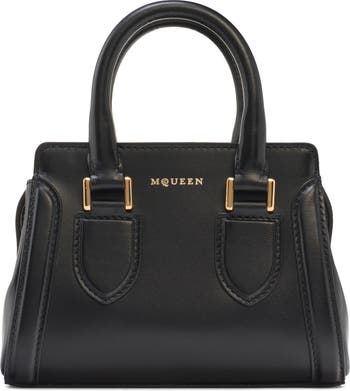A minimalist McQueen logo cleanly brands this Italian-made leather bag built in a compact, structured silhouette furnished with rolled handles and a removable crossbody strap.