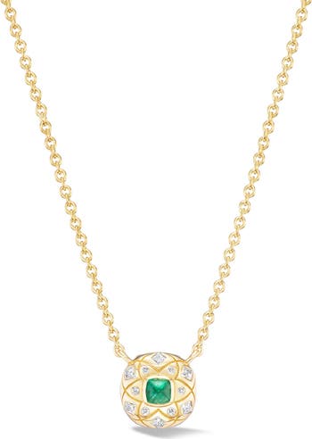 Sparkling diamonds frame the lustrous emerald stone of an exquisitely detailed pendant necklace inspired by lotus petals and set on a slender 18-karat gold chain.