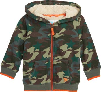 A soft and shaggy lining keeps your young adventurer warm as he takes on the outdoors in this sporty raglan-sleeve hoodie in a rugged camo print.