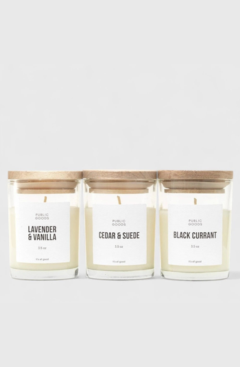 Treat yourself or a loved one with this 3-Piece Mini Candle Set, a thoughtful gift for any occasion. Each 3.5 oz candle comes in a plastic-free glass jar with an upcycle-ready acacia wood lid, designed to be repurposed long after the wax is gone. With three unique scents—Black Currant (tart fruit and fresh florals with a dark, earthy edge), Cedar & Suede (sandalwood, jasmine, Turkish rose, amber, and leather notes), and Lavender & Vanilla (calming lavender blended with vanilla, fir needles, and tonka bean)—this set brings warmth and atmosphere to any space.