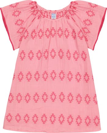 Get ready for some beach fun with the Mini Capucine Girl's Caftan! This boho chic cover up doubles as a playful beach dress, featuring whimsical embroidery, elasticized neck and roomy flutter sleeves. Perfect for a carefree and stylish look. 100% cotton gauze.