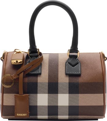 A bowling bag made in Italy from a coated cotton blend printed with the Burberry Check and lined in a solid colour. The compact design is trimmed in smooth calf leather and features a leather-wrapped padlock and key. A detachable strap switches the style to a shoulder bag.||Rolled leather top handles|Detachable, adjustable leather strap|Zip closure|Hand-painted edges|Polished metal hardware|Leather-wrapped padlock and key|Embossed Burberry lettering at padlock|Cotton blend lining|Comes with a dust bag