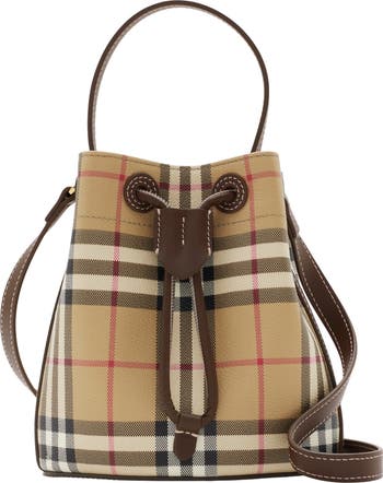 A bucket bag made in Italy from a coated cotton blend printed with the Burberry Check. The softly structured shape is lined in cotton and features a drawcord closure with a leather shield toggle. Carry by the top handle or wear as a crossbody bag using the adjustable strap.||Leather top handle|Adjustable leather crossbody strap|Drawcord closure|Hand-painted edges|Polished metal hardware|Cotton lining|Comes with a dust bag