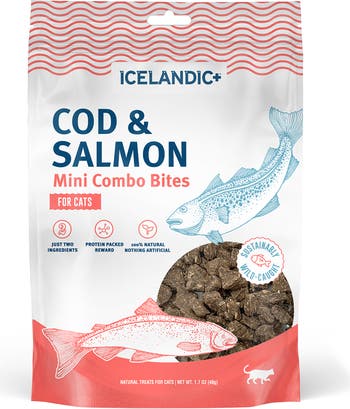ICELANDIC+ MINI COMBO BITES COD & SALMON - 1.7OZ - Elevate your cat’s snacking experience with our Mini Combo Bites, a deliciously crunchy, healthy treat made from just two ingredients - wild-caught cod & salmon. These bites are more than just a tasty delight—they’re a powerhouse of nutrition. Bursting with high-quality protein and rich in omega-3 fatty acids, they support your cat's brain function, eye health, and skin & coat vitality. Meow! Handcrafted in Iceland with just two ingredients - sustainably sourced cod and salmon - slow baked with geothermal energy. These crunchy mini morsels are big on irresistible flavor and loaded with Omega 3's and protein for extra nourishment. For freshness and convenience, our fish are packaged in a stand-up resealable bag. Each package contains net wt. 1.7 oz. of Icelandic+ Mini Combo Bites. Each treat is about 0.25" in length. THE BEST TREATS FOR THE MOST LOVED PETS. KEY HIGHLIGHTS: Pure fish treats for cats. Omega-3s help to support eye, brain, heart, joint and skin & coat health. Sustainably sourced, wild caught fish. Just 2 ingredients. High protein, low calorie reward. Slow-baked with geothermal energy for a light, airy crunch. Made without artificial flavors, fillers, additives or preservatives. Grain-free, gluten-free, non-GMO ingredients. 100% natural. Made in small batches in Iceland. 100% Viking—air-dried as the Vikings did in 900 A.D. INGREDIENTS: Cod & Salmon. GUARANTEED ANALYSIS: Crude Protein (Min) 70.0%. Crude Fat (Min) 3.4%. Crude Fiber (Max) 0.5%. Moisture (Max) 10.0%. Omega 3 Fatty Acids* (Min) 0.5%. CALORIE CONTENT: 3,180 kcal/kg, 3 kcal/g (Calculated ME).